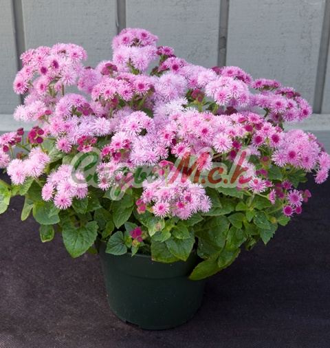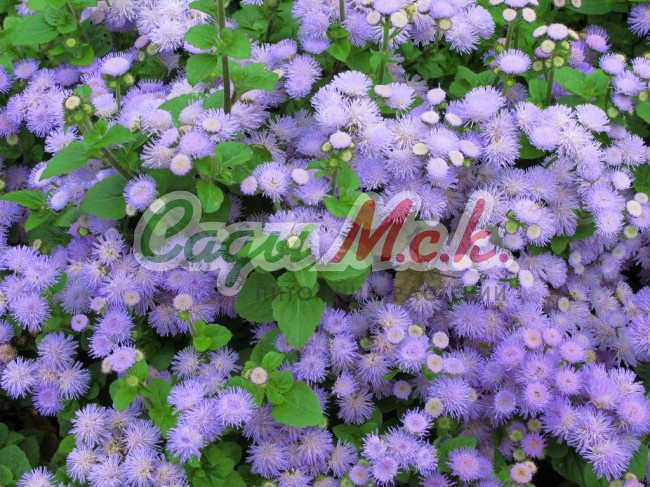 Очень красивая и длительно цветущая смесь сортов с большими пушистыми шапками соцветий. Растения из семейства Астровые, высотой 20-25 см. Цветение обильное с июня до заморозков. Соцветия мелкие, душистые, до 1-1,5 см, собраны в более крупные щитковидные соцветия до 8-10 см в поперечнике. Окраска разнообразная. Агератум засухоустойчив, светолюбив, но может расти при небольшом затенении, предпочитает легкие, умеренно плодородные почвы. Теплолюбив, заморозков не переносит. Используют на клумбах, в рабатках, миксбордерах, агератумами украшают балконы.