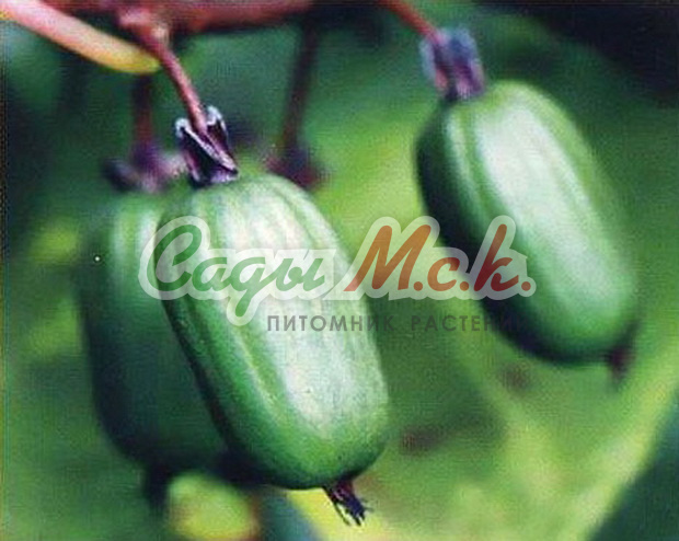 Ягоды вызревают к середине-концу августа. Они достаточно крупные (до 4,5 г), ярко-зеленые, в форме очень вытянутого овала с еле заметными светлыми продольными полосками. Имеют приятный кисло-сладкий вкус и чудесный земляничный аромат.