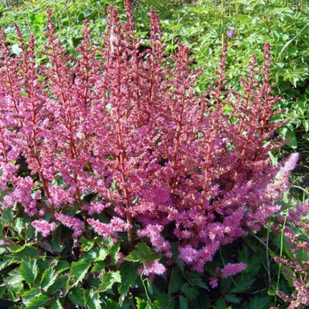 Саженцы астильбы Vеrоniса Klоsе – это компактные среднерослые кусты с темно-зелеными листьями и красными стеблями, на которых в июле-августе появляются густые метельчатые соцветия темных лилово-розовых тонов. Этот сорт замечательно смотрится в композициях с другими многолетниками, а также в множественных посадках. Саженцы данного сорта предпочитают полутень, а также зоны разреженной тени. Главное – не допускать пересыхания почвы.