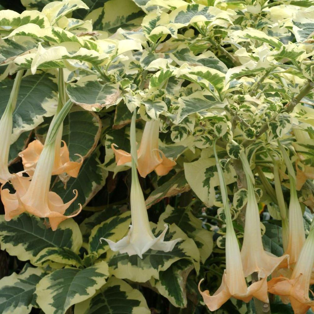 Brugmansia Variegata - большой куст, достигает 4 метра в высоту. Листья огромные, пестрые с белыми вкраплениями, овально-ланцетные, полу-вечнозеленые. С конца лета до конца осени сорт цветет обильными висячие, 50 см длиной, трубчатыми кремовыми цветками, которые обладают приятным запахом, усиливающимся вечером и ночью.