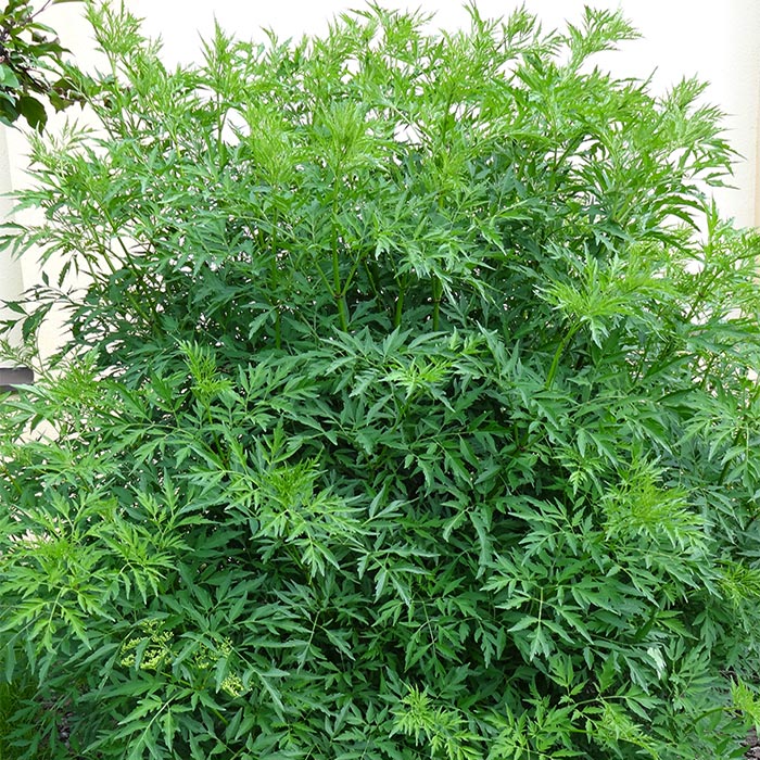 Бузина Лациниата, которую также называют рассечённолистной, представлена быстрорастущим листопадным кустарником, вырастающим до 4 м в высоту в условиях умеренного климата. Некоторые представители вида, произрастающие на территории Западной Европы, могут достигать 10 м в высоту. Куст имеет широкую ажурную крону с распростёртыми ветвями, диаметром до 3 м. Побеги взрослого растения покрыты светло-серой корой. В Древней Греции чёрную бузину считали священным растением, поэтому высаживали у домов для защиты от нечисти. На ветвях содержится множество крупных тёмно-зелёных листьев, до 20 см в диаметре, внешний вид которых напоминает вайи папоротника. Листья при растирании имеют специфический аромат. Цветение растения припадает на начало лета, бутоны мелкие, окрашены в белый или кремовый цвет и собраны в пышные зонтиковидные соцветия. На месте цветков образуется плод — ягода пурпурно-чёрного цвета с глянцевой кожурой