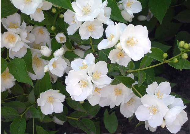 Чубушник Mont Blanc - куст высотой около 2 м, со слегка изогнутыми побегами. Цветет ежегодно и обильно, около 20-25 дней. Цветки кремоватые, полумахровые, в коротких соцветиях по 3-5(9) шт, с земляничным ароматом.