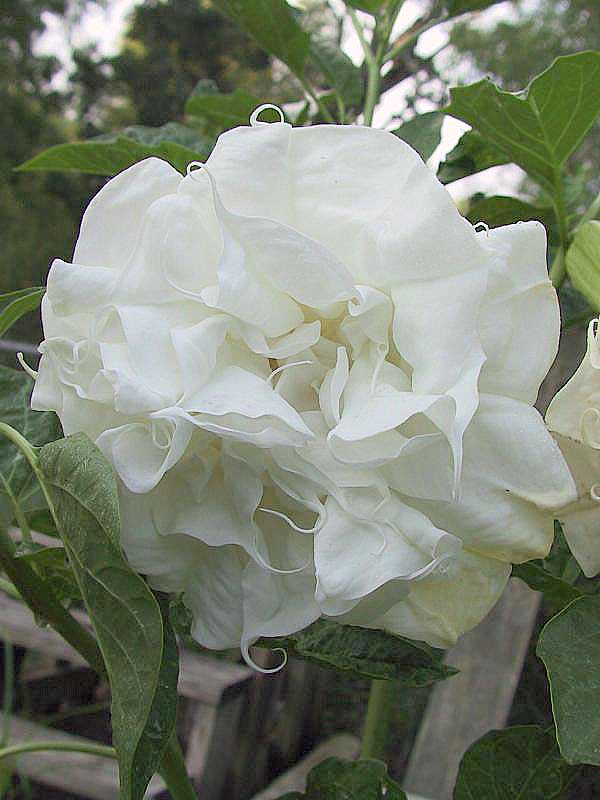 Дурман метел Балерина Вайт — это очаровательные колокольчики с округлыми плодами. Травянистый стебель вырастает на 50 см вверх. Его украшают махровые соцветия в форме граммофонов и плоды с многочисленными острыми шипами. Сердцевидные светло-зеленые листья опушены вниз. Воронковидные бутоны окрашены в нежный белый цвет. Применяется для оформления клумб, при посадке в контейнеры и вазоны.