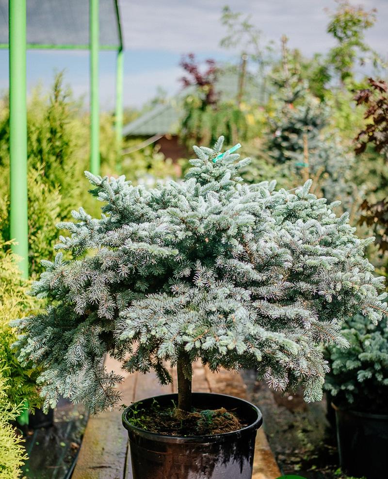 Ель шаровидной формы, широкая, цвет насыщенно голубой. Это одна из лучших разновидностей колючей ели