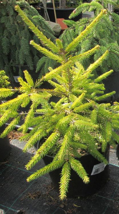 Ель обыкновенная «Акрокона Голден» - уникальный сорт с интересными декоративными характеристиками. Форма кроны ширококоническая, часто неправильная. Ветви густые, раскидистые, с поникающими концами. Растет медленно, к 10 годам едва достигает 1 м, а в зрелом возрасте при высоте около 2 м диаметр кроны составляет более 2-3 м. Хвоя зеленая, густая, расположена под острым углом к побегу. Молодые приросты сочного светло-зеленого цвета. Яркий отличительный признак ели «Акрокона Голден» - малиновые шишки, образующиеся на концах побегов даже у молодых деревьев.