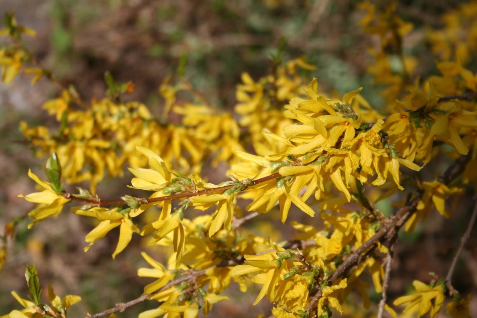 Форзиция Spectabilis - раскидистый кустарник с сильными прямыми и поникающими побегами высотой 1 м. Листья среднего размера, зубчатые, темно-зеленые, жесткие. Куст сохраняет интенсивную окраску в течение всего сезона, не подгорает и не повреждается вредителями. Осенью окрашивается в фиолетовые цвета. Цветки желтые, 3-4 см в диаметре, собраны в пучки по 3-6 штук, густо покрывают побеги по всей длине. Цветет в апреле, до распускания листьев, очень обильно.