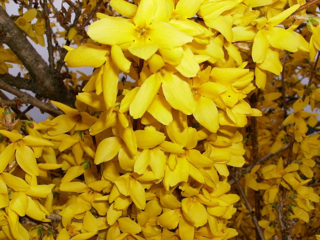 Форзиция Vitellina - быстро растущий кустарник высотой и шириной 2.5 м. Цветки темно-желтого цвета появляются в конце зимы или ранней весной, до появления листьев.