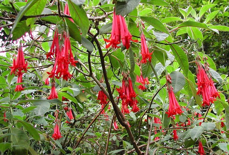 Fuchsia boliviana – вечнозеленый кустарник с эллиптическими листьями и крупными темно-красными цветами. Высота растения достигает 1 м. Цветы собраны в гроздья. Цветоносы огромные, достигают 30 см в высоту, на них изящно свисают цветы. Цветет кустарник с первых чисел марта и по конец апреля.