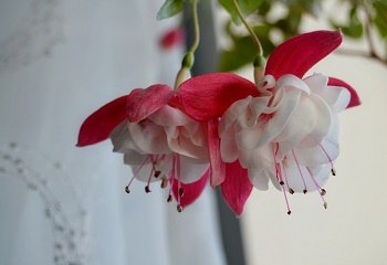 Фуксия Snow Burner - ампельная форма. Цветки поражают своей величиной и красотой. Цветы махровые, огромные. Чашелистики Темно-красные. Юбочка белоснежня с небольшой краснотой у основания.