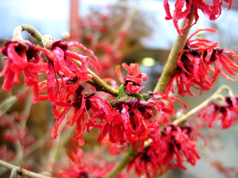 Гамамелис промежуточный Рубин - это прямой, округлый лиственный кустарник или небольшое дерево с широко овальными, морщинистыми зелеными листьями, которые осенью приобретают оттенки желтого и оранжевого. Слегка надушенные рубиново-красные цветы с узкими гофрированными лепестками несут на голых ветвях в конце зимы и ранней весной.