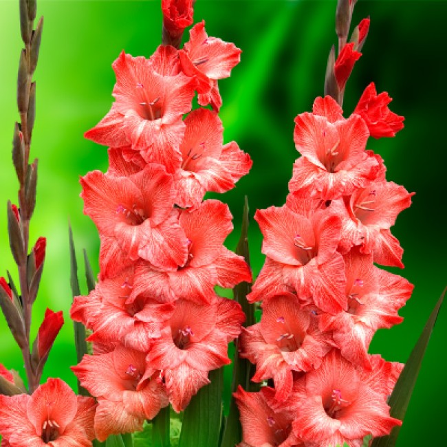 Гладиолус Бьюти Принт относится к крупноцветковым сортам. Лепестки сильно гофрированные. Цвет яркий, коралловый, к концам лепестков осветляется, присутствуют белые мазки в середине лепестков.