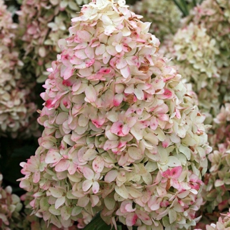 Гортензия Magical Candle - один из красивейших сортов метельчатой гортензии, отличающаяся обильным, продолжительным цветением и яркими цветами. Куст высотой 1,2-1,5 м. Цветет на побегах текущего года с июля и по октябрь. Цветы бело - кремовые с зеленоватым оттенком, осенью окрашивются в розовые тона, ароматные, собранные в гигантские метелки широкопирамидальной формы. Отличительной особенностью является необычная форма цветка с вытянутыми лепестками. Соцветия очень плотные, длиной до 30 см., иногда бывают настолько большими, что могут возникать сложности при выращивании этого сорта в контейнере. Многочисленные цветы расположены на очень сильных побегах, растущих строго вертикально, благодаря чему габитус куста довольно компактный. Совершенно роскошное растение при использовании в качестве солитера, подходит для групповых композиций, живых изгородей. Предпочитает плодородные, проницаемые, слегка кислые почвы. Место посадки - солнце, полутень. Величина и количество соцветий зависят от весенней обрезки. Чем сильнее обрезка, тем крупнее будет цветок, но цветов будет меньше, и наоборот. Неприхотливый устойчивый вид, выдерживающий без укрытия даже очень суровые зимы