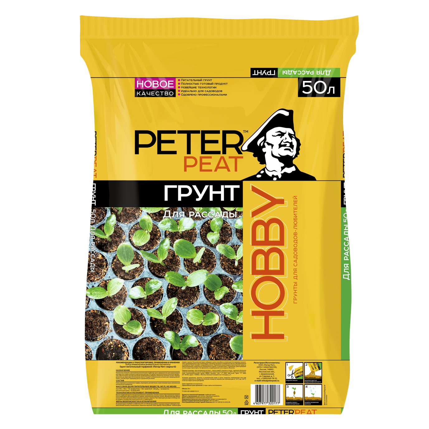 Грунт для рассады (линия Хобби) 50 л - для выращивания рассады всех видов овощных и цветочных культур. Не требует дополнительного внесения удобрений, обеспечивает рассаду растений необходимым набором элементов питания на весь период развития до пересадки на основное место. Повышает всхожесть семян и приживаемость рассады.