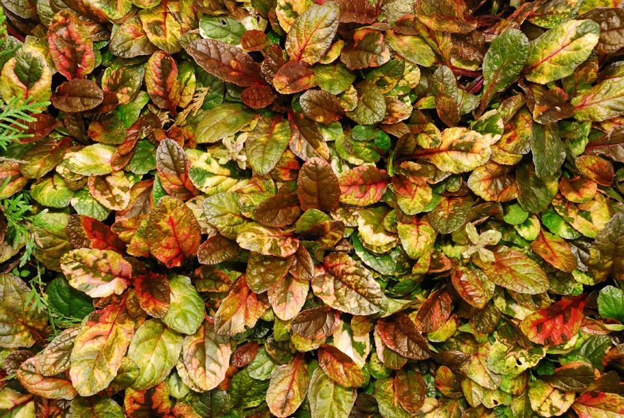 Multicolor — это низкорослый сорт живучки с разноцветными вечнозелеными листьями, называемый также «радугой». Высота растения не превышает 20 см, в ширину куст обычно распространяется на 40 см. Листья овальные с выраженными прожилками. Преобладающие цвета: кремовый, желтый, фиолетовый, розовый, зеленый. Окраска варьируется в зависимости от времени года и степени освещенности места высадки.