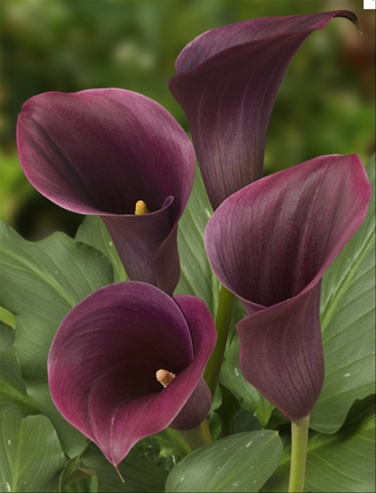 Калла Капитан Промис - изюминка сорта кроется в эффектной и броской окраске. Цветки темно-пурпурного цвета, воронкообразной формы. Листья стреловидные, остроконечные или в форме сердца, темно-зеленые с белым крапом. Высота до 70 см.