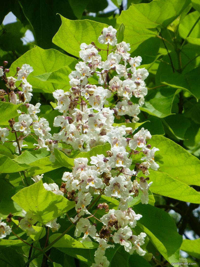 Саженцы Катальпа Aurea вырастают в невысокое дерево с ассиметричной кроной. Данный сорт выполняет свою основную функцию – декоративную, он служит отличным украшением для любого сада. Листья дерева светло-зеленые очень крупные имеют форму сердца, распускаются поздно. Большие соцветия белого цвета формируются в розетки, их длина может достигать тридцати сантиметров. На деревцах также присутствуют отдельные желтоватые цветки с малиновыми вкраплениями. Плоды этого крупномера очень необычны и интересны, их форма в виде стручков очень похожа на бобовые культуры.