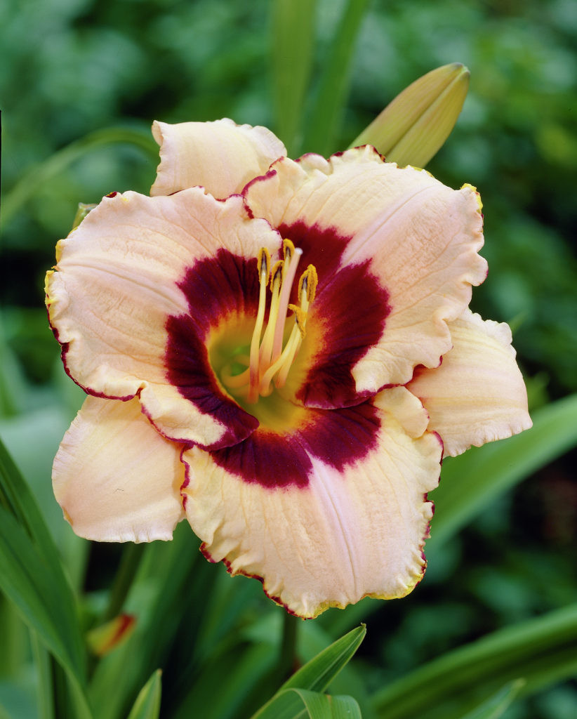 Цветки биколор. Внешние лепестки белые, внутренние – кремовые, со сливовым глазом и тонкой каймой. Края немного гофрированы. Горло лимонное. Сорт ранний, зацветает в июне. Цветки распускаются в течение месяца. Лилейник предпочитает хорошо увлажненные участки, прекрасно себя чувствует возле водоемов. Растет на солнце и в полутени.