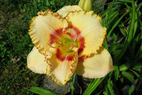 Саженцы лилейника Siхth Sеnсе — полувечнозеленый куст с крупными не махровыми цветами кремово-желтого цвета с красноватым глазком. Сердцевина цветка имеет светло-зеленый цвет. Украшены цветы этого сорта красно-желтой узкой каймой на гофрированных листьях. Крупномер Siхth Sеnсе отличается необычностью и красотой. Используется для украшения клумб, цветников. За высокую декоративность любим профессиональными флористами. Лилейник в высоту может достигать 61 см, диаметральные размеры цветка – до 15 см, цветет в июле. Относится к триплоидам, повторного цветения нет. Окраска цветка — кремово-желтая с красным глазком и красно-желтой каймой. Горло — желто-зеленое. Не махровый. Тип цветения — долгоцветущий. Требование к освещенности — любит солнечные клумбы.Требование к почве — особых требований не предъявляет. Требования к поливу — любит небольшую засуху.
