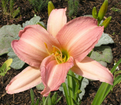 Лилейник Winsоmе Lаdу – один из самых красивых многолетников современной селекции. Растение относится к группе раннецветущих лилейников и распускается в конце июня. Удивительное сочетание и расположение цветовой гаммы – основной палево-розовый цвет с бледно-оранжевым размытым обручем. На таком нежном фоне особенно контрастно выделяется зеленое горло. Лепестки – отогнутые и закрученные, со слегка гофрированными краями. Цветки – ароматные, очень крупные, достигающие в диаметре 14 см, хотя само растение имеет средние размеры. Популярность сорта объясняется не только его внешним видом, но и удивительной живучестью. Он приспособлен расти в любых условиях, за что и удостоен наград различного уровня.