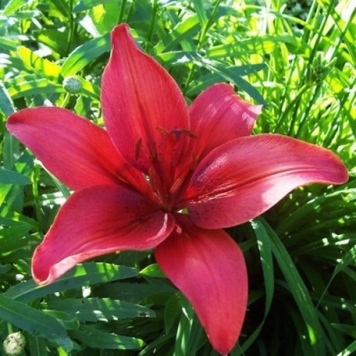 Лилия азиатская Солфарино (Lilium asiatic Solfarino) во время цветения внесет в палитру вашего сада красочные акценты. Красно-малиновые глянцевые лепестки с вишневыми прожилками и пурпурным крапом великолепно смотрятся на фоне сочной летней зелени. Этот сорт красив как в одиночных посадках, так и в групповых ландшафтных композициях.