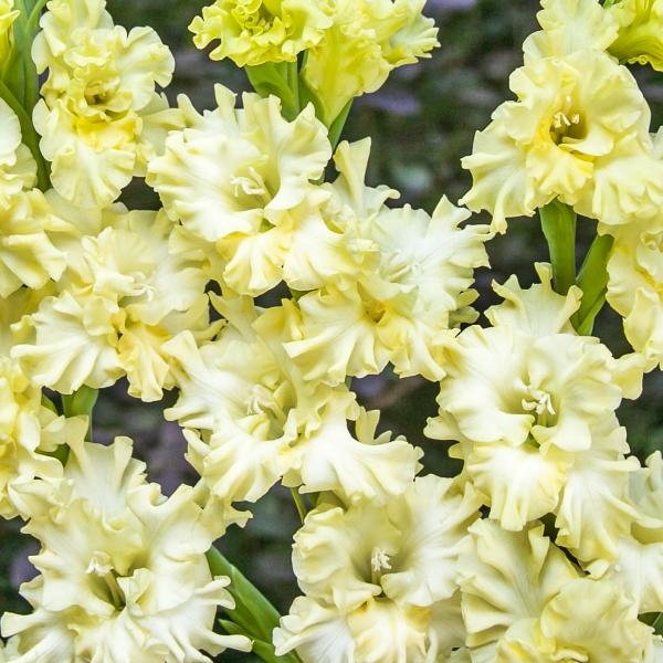 Луковицы Гладиолуса гофрированного Лемон Раффл (Gladiolus Lemon Raffl) обеспечат на несколько лет сад шикарными живыми букетами, которые будут радовать взор с июля по октябрь – в течение цветения. Данный сорт отличается особой изысканностью – изобилием соцветий из гофрированных лепестков, собранных в воронкообразную форму. Они имеют нежный лимонный оттенок, который в сочетании с зелеными линейными листьями на сильных стеблях делает Лемон Раффл королем сада. Растение имеет крупные размеры – в высоту до 110 сантиметров. Сорт Гладиолуса гофрированного Лемон Раффл нетребователен в уходе: полив, солнце и подкормка на период цветения. Осенью луковицы выкапывают для хранения.