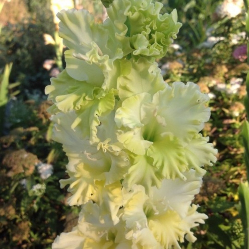 Луковицы гладиолуса крупноцветкового Брейк ов Дон ценятся за утончённую неброскую красоту и продолжительное цветение. Изящный цветок с удлинёнными шелковистыми волнистыми лепестками окрашен в сливочно-белый оттенок с кремовым центром. Посадите Брейк ов Дон на клумбу, окружив растениями ярких расцветок и он не потеряется на фоне соседей, а лишь подчеркнёт их окраску. Прекрасен гладиолус и в букете, нежной и спокойной красотой. Высота растения от 100 до 120 сантиметров, длина цветоноса до 80 сантиметров. Цветение Гладиолуса крупноцветкового Брейк ов Дон начинается в конце июля и продолжается более 2 недель.