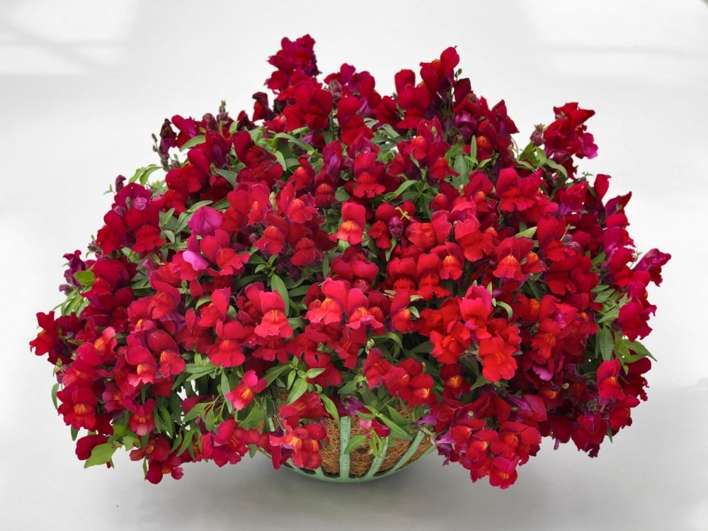 Антирринум (Львиный зев) – декоративный и очень популярный однолетник. В настоящее время создано множество его форм, которые отличаются окраской цветков, высотой и формой куста. Данный гибрид является редкой ампельной разновидностью растения, формирующей аккуратный мини-шар из кистевидных темно-пурпурных соцветий. Растение карликовое, высотой 20 см, цветет с конца июня до поздних заморозков. Культура холодостойкая и светолюбивая, к почвам нетребовательная, в засушливый период нуждается в поливе. Выращивают Львиный зев рассадным способом. Посев проводят с начала марта до середины апреля, поверхностно, не заделывая в ящики с субстратом, и ставят на свет. Всходы появляются через 8-12 дней. Рассаду высаживают во второй половине мая с расстоянием между растениями 10 см. Растение особенно эффектно выглядит в подвесных кашпо.