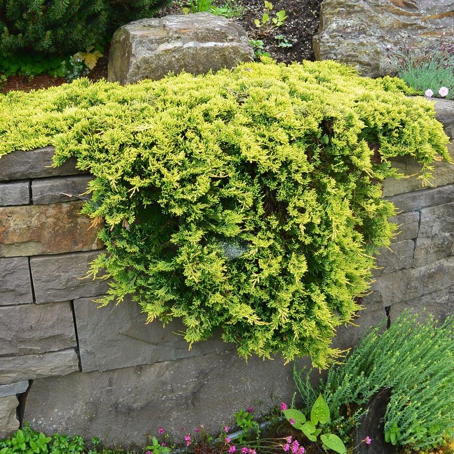Можжевельник Golden Carpet - популярный стелющийся сорт можжевельника с ярко-золотистой хвоей. Высота растения не превышает 15см, и диаметр кроны 1,5м. Растет медленно, по 10 см в год. Побеги длинные стелющиеся сверху покрыты золотистой чешуйчатой мелкой хвоей, снизу желто-зеленой, покрывают землю словно ковром. Отлично подойдет для украшения альпинария, хвойных клумб, послужит ярким украшением для любой композиции. Любит солнечные места, в тени золотистая окраска тускнеет.