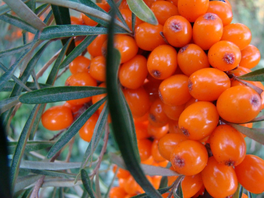 Саженцы облепихи Пантелеевская вырастают в среднерослые кусты с раскидистыми кронами. Колючесть выражена слабо. Ветви облепихи могут поникать под тяжестью урожая. Плоды расположены рыхло. Плоды крупные, красно-оранжевые, удлиненно-овальные, сладкие. Созревают в середине сентября. Крупномер Пантелеевская имеет плодоножки длиной 4,0 мм. Кожица прочная. Усилие отрыва ягод среднее. Мякоть плотная. Плодоносит обильно и ежегодно.