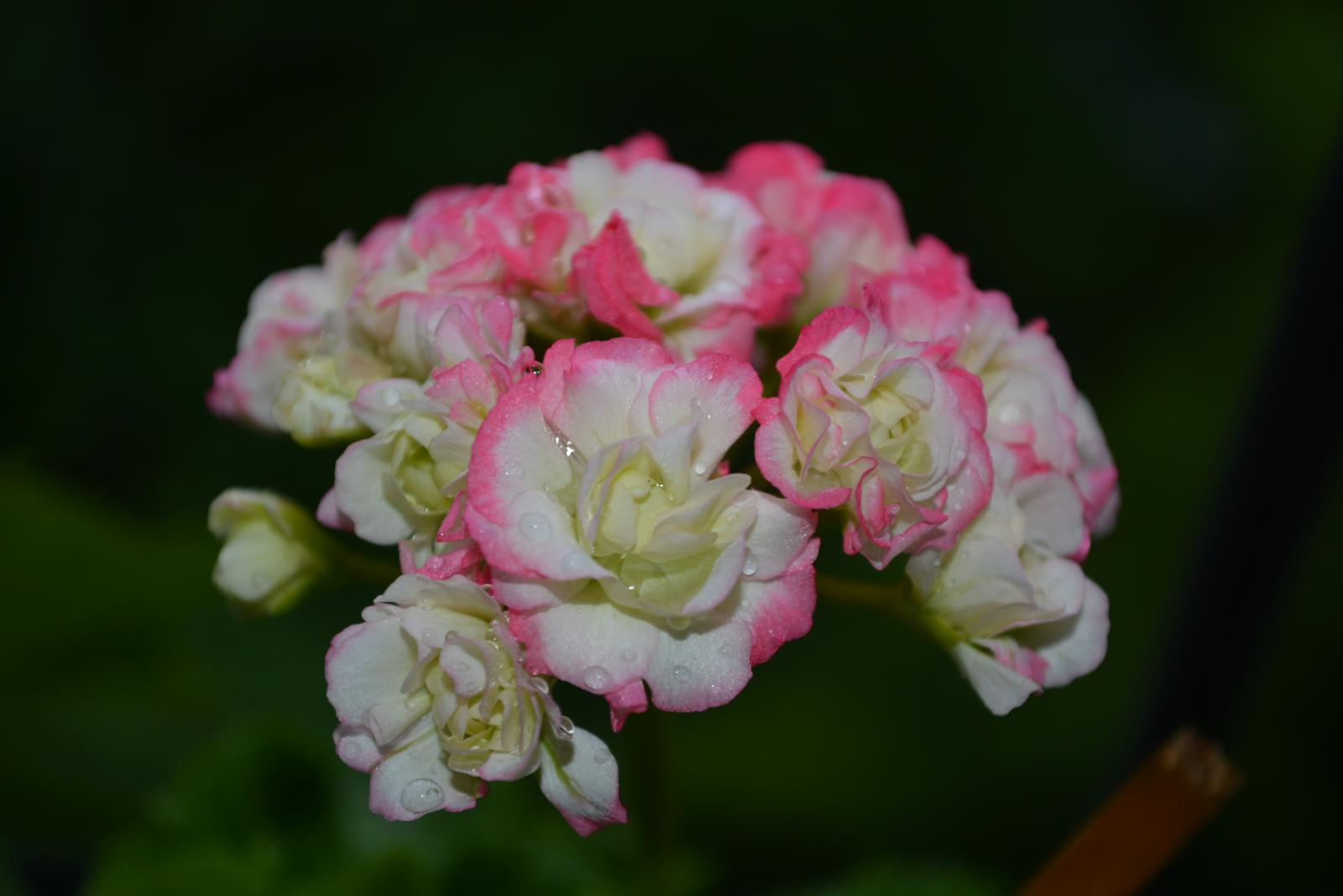 Пеларгония Happy Appleblossom - аккуратный среднерослый кустарник. Листья 3-5 лопастные, темно-зеленые со светло-зеленой бабочкой в центре. Махровые цветки находятся в крупных густых соцветиях. Окрас цветков белый, с розовой каймой лепестков и светло-зелеными оттенками у основания.