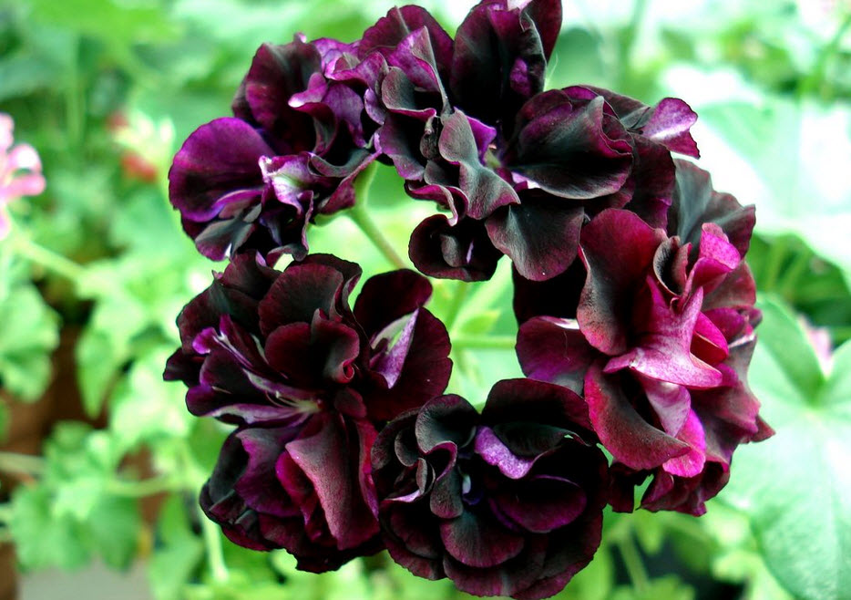 Красивый, свободно разветвляющийся, махровый, плющелистный сорт. Цветки глубокие, бархатисто-фиолетовые с белыми вспышками на большинстве лепестков