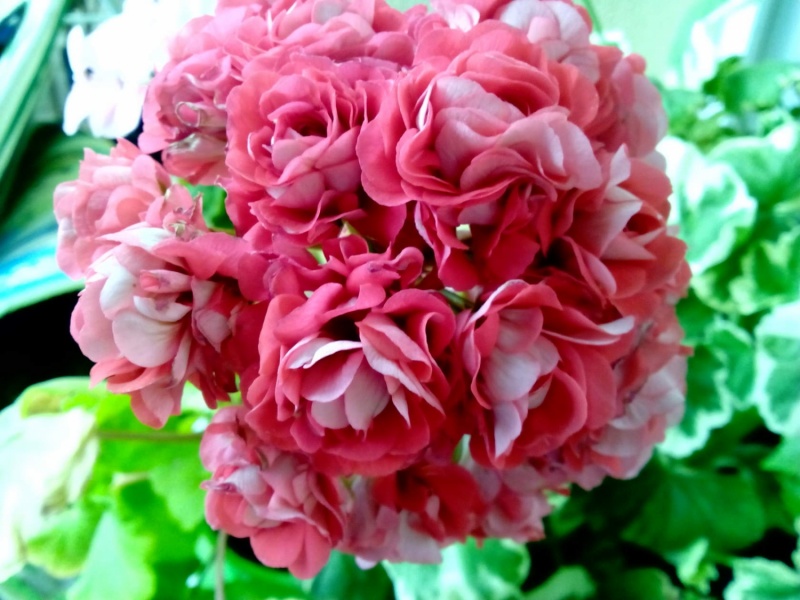Пеларгония Pink Rambler отличается своими маленькими цветочками, которые по форме напоминают розы. Цветки махровые, двухцветные: внутренняя часть лепестков розово - коралловая, а внешняя - белая со слабыми розовыми оттенками. Соцветия-шапки очень крупные. Листья большие, 5-лопастные с темной зоной посередине каждого листочка.