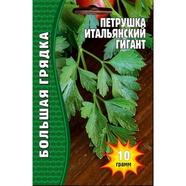 Петрушка листовая Итальянский гигант. - среднеспелый сорт (65-70 дней от всходов до уборки на зелень). Имеет крупную, полувертикальную розетку, высотой от 32 до 60 см, в которой формируется 20-25 листьев. Листья треугольной формы, темно-зеленые, среднего размера, очень ароматные. Этот сорт хорошо отрастает после срезки. Черешок средней длины со слабым антоцианом.