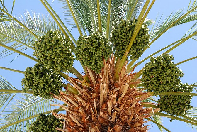Phoenix dactylifera Khadrawy - дерево с раскидистой кроной и мощных стволов. На верхушке ствова есть черешки от опавших листьев. Молодые листья на длинных стеблях, светло-зеленые, состоят из игольчатых листочков. После цветения на дереве появляются большие кисти маленьких плодов.