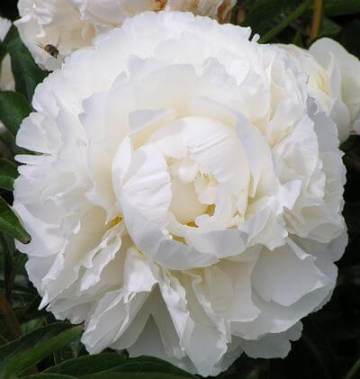 Травянистый пион Bowl of Cream махровый, розовидный. Огромные пышные соцветия имеют кремово-белый цвет. А благодаря желтому центру бутона кажется, будто они подсвечены изнутри. На фоне удлиненных темно-зеленых листьев соцветия выглядят просто роскошно. Высота 80 см. Размер цветка 19 см.
