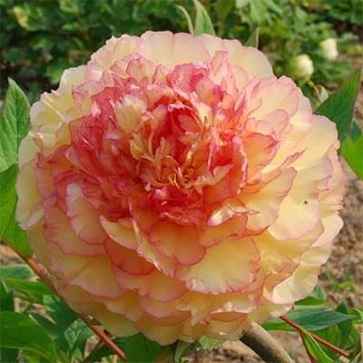 Множество великолепных густомахровых, вертикально расположенных бутонов древовидного пиона Jin Ge (Kinkaku) отличаются нежными лепестками изысканного золотистого цвета. Их удивительная розово-фиолетовая окантовка добавит нотку утонченной роскоши в настроение вашего сада. Рост интенсивный. Цветение обильное, в конце сезона.?Цветы 17?8 см. Высота куста 1,5-2,0 м. Диаметр куста до 1,8 м.?