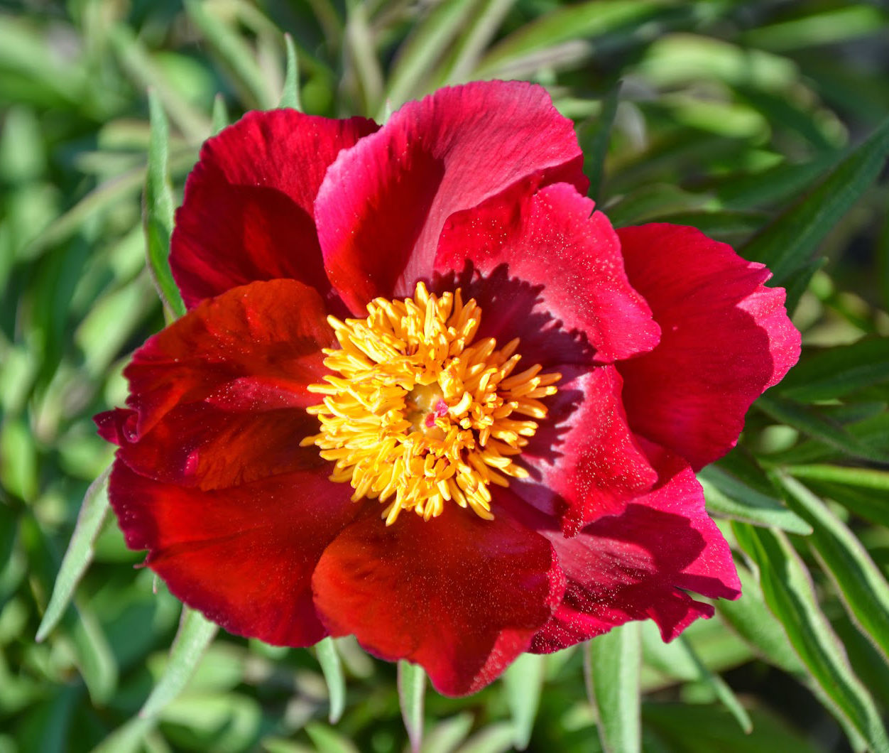Саженцы пиона Early Scout относятся к многолетним травянистым растениям, обладают мощной корневой системой и прямостоячими стеблями. Крупные лепестки имеют насыщенный темно-красный цвет, в центре бутона располагаются короткие желтые тычинки на красной ножке. Особо красиво данные соцветия выглядят на фоне узких зеленых рассеченных листьев. Этот сорт непременно создаст в саду атмосферу роскоши и великолепия. Early Scout характеризуется ранним сроком цветения и приятным ароматом. Со временем саженцы формируют красивый куст аккуратной шаровидной формы, его высота достигает всего пятьдесят сантиметров.