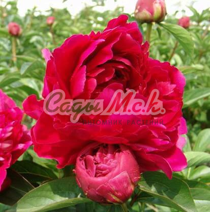 Травянистый пион Felix Kruss махровый, полушаровидный. Лепестки собраны в соцветия карминно-красного цвета с фиолетовым оттенком. Темно-зеленая листва создает для них прекрасный фон, оттеняя и выделяя их. Ненавязчивый приятный аромат. Высота 90 см. Размер цветка 17 см.