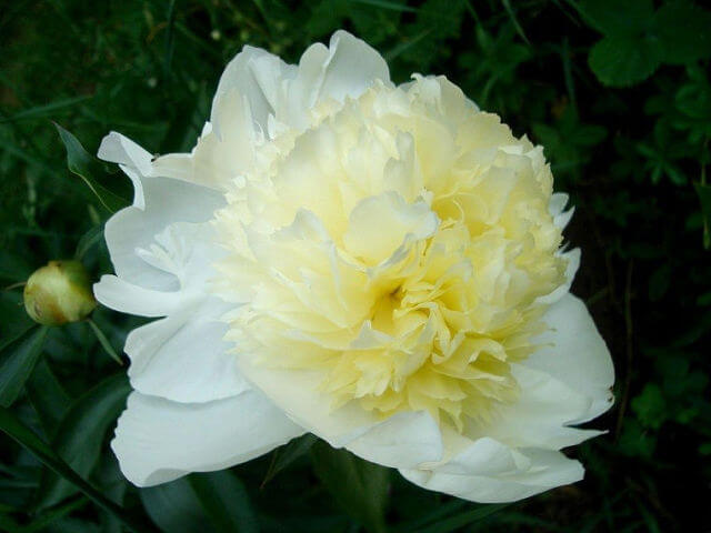 Травянистый пион Laura Dessert имеет средний срок цветения, бутоны начинают распускаться с мая. И цветет на протяжении всего июня, образуя на пышном кустарнике крупные соцветия с широкими крайними лепестками белоснежного оттенка и густой желто-кремовой короной в центре. Внешние лепестки широкие а внутренние маленькие, такое сочетание создает двух ярусную форму. Диаметр цветка достигает 15 см, аромат нежный, сладкий. . Высота куста пиона этого сорта достигает 80-100 см, стебли прочные с узкими темно-зелеными листьями.