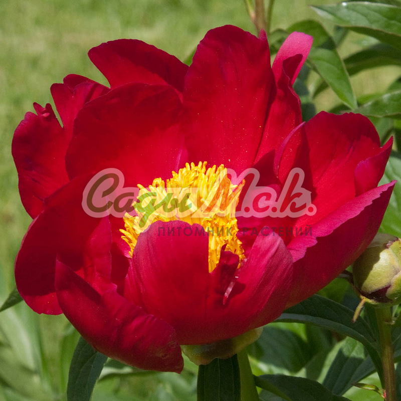 Травянистый пион Maestro махровый с открытым центром. Запах слабый. Средний срок цветения. Цветок диаметром 16 см. Тёмно-красный с каштановым оттенком, центр заполнен ярко-желтыми тычинками. Куст высотой 80 см. Стебли прочные. Листья тёмно - зелёные, блестящие.