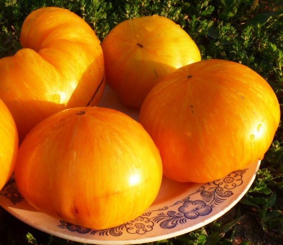 Помидор Pork Chop - сорт высокорослый, ранний. Плоды плоско-округлой формы, слаборебристые, желто-оранжевые с золотистыми полосами. Вес плода достигает 200 грамм. Мякоть сладкая, с цитрусовым привкусом. Урожайность сорта высокая.