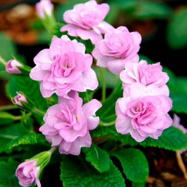 Примула Quackers Bonnet - розово-фиолетовая, сиреневая, или лилово-розовая Английская махровая примула. Цветки несколько похожи на миниатюрные розы. Почти вечнозеленые листья, как правило, скрывают первые цветки, которые появляются очень рано. Но, как только наступает пик цветения ранней весной, листья эффектно контрастируют с цветками. Листва плотная, остается зеленой до самой осени. Розетка листьев прикорневая. Данное растение вырастает в высоту до 15 см, а в ширину – до 15-30 см. Время цветения: апрель-май.