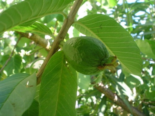Гуава обыкновенная Бассатин Эдфина - сорт, выведенный в Египте. Вечнозеленый ветвистый куст или деревце семейства Миртовых, родом из Бразилии и южной Мексики, до 8-10 м в высоту. Листья большие, овальные и ярко-зеленые, до 8 см длиной, глянцевые сверху и бархатистые снизу. Эта особенность говорит о том что гуава растет на открытом солнце: блестящая глянцевая поверхность листа легко отражает палящие солнечные лучи, а нижняя, бархатистая, препятствует испарению лишней влаги.