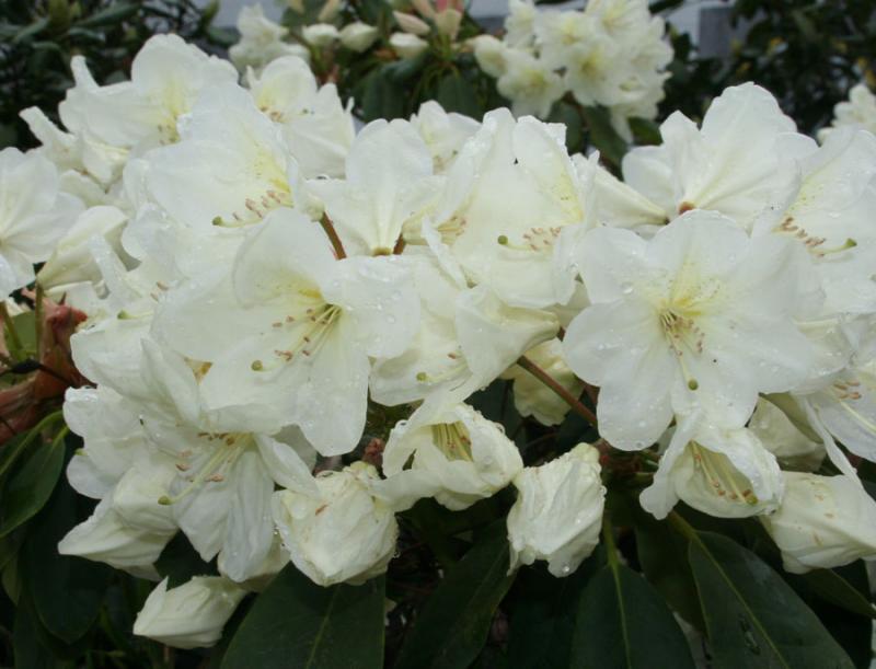Рододендрон Cunningham’s white - вечнозеленый, раскидистый, сильноветвистый кустарник. Листья крупные (до10-12см), эллиптические, темно-зеленые, кожистые. Цветки белые с бледно-фиолетовым и коричневым крапом на верхнем лепестке (до 5см), без запаха, собраны в соцветия по 7-8 штук. Цветет в начале июня.