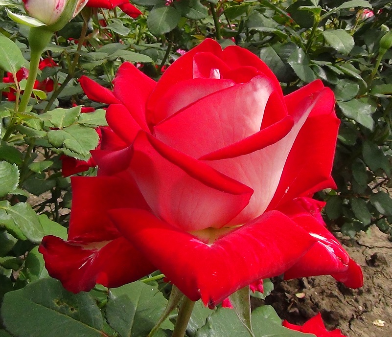 Среднерослые кусты вырастают до 1,2 м в высоту и до 0,7 м в ширину. Стебли прямые, покрыты крупной, темно-зеленой листвой. Размер бутонов – около 7-8 см. Цветки одиночные, двухцветные – красные изнутри и белые снаружи. Источают легкий, ненавязчивый аромат. Крупномер Alliance устойчив к вредителям, но в неблагоприятные годы может болеть. Период цветения длится с июня по октябрь. Хорошо приживаются на открытых, солнечных участках с отсутствием сквозняков.