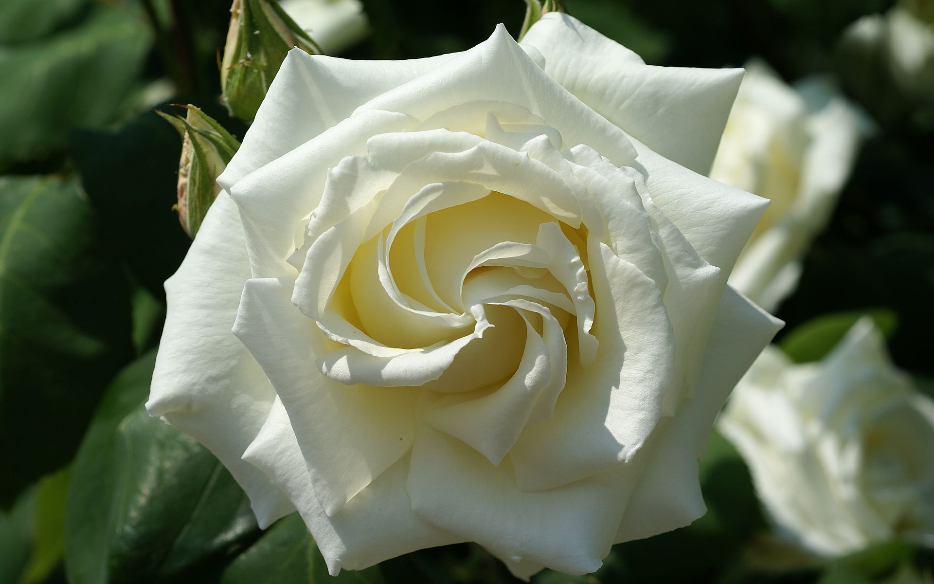 Среднерослый куст вырастает до 1 м в высоту и около 0,75 м в ширину. Стебли покрыты мелкими шипами и темными, блестящими листьями, подверженными различным заболеваниям. Крупномер Bianca формирует кисти по 3-9 бутонов. Цветки махровые, в начале открыто-чашевидной, а после – плоской формы. Оттенок – белоснежный с нежной зеленью. Размер цветка – 8-10 см. Цветение начинается в начале лета и длится до октября. Саженцы предпочитают защищенные от ветра участки с увлажненной и дренированной почвой.