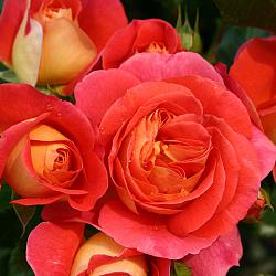 Gebruder Grimm - это роза с очень ярко окрашенными цветками ностальгической формы. Цветки 7-8 см в диаметре, густомахровые, появляются в кистях и цветут очень обильно и длительно. Цветок долго не осыпается. Лепестки оранжево-красные, очень изменчивой окраски в зависимости от сроков цветения, погоды и времени года. Аромат легкий. Куст высотой 60-70см, а шириной около 50 см. Листва блестящая, темно-зеленая. Высокая устойчивость к дождю, неблагоприятным погодным условиям и заболеваниям.