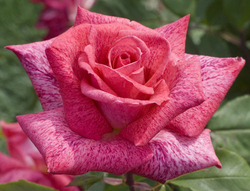 Роза Pierre Cardin - роскошный крупноцветковый сорт для любителей редкостей. Розовые лепестки усыпаны крапинками более темного цвета. Цветки состоят примерно из 32 лепестков, обладают насыщенным ароматом майской розы с зелеными нотами. Диаметр цветка 10 - 12 см, высота растения 80 - 100см. Сорт очень устойчив к заболеваниям и зимостоек. Куст ветвистый, с множеством побегов.