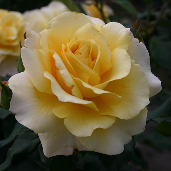 Роза Sunny Sky - нежно-желтый цветок, в центре темнее, махровый. В одном цветке находится 20-30 лепестков. Бутоны оранжево-жёлтые с красными краями, бокаловидные. Диаметр цветка 8-10 см, высота растения 100-120 см. Характеризуется легким фруктовым ароматом.Цветение обильное, продолжительное, повторное. Растение хорошо разветвлено, с прочными прямостоячими побегами. Обладает высокой устойчивостью к пятнистости, мучнистой росе, морозам.