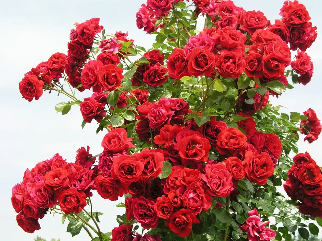 Роза Sympathie - прекрасные, элегантные, махровые, с высоким центром и слегка отгибающимися лепестками, диаметром около 10 см, насыщенные, ярко-красные до темно-малинового с восхитительным бархатным эффектом и легким ароматом цветки. Цветение раннее, обильное (цветы собранны в кисти от 3 до 10 штук), непрерывное. Листья насыщенные ярко-зеленые, глянцевые. Высота куста от 2,5 до 3,5 м. Морозостойкий, с отличной устойчивостью к болезням, дождям и ветрам сорт.